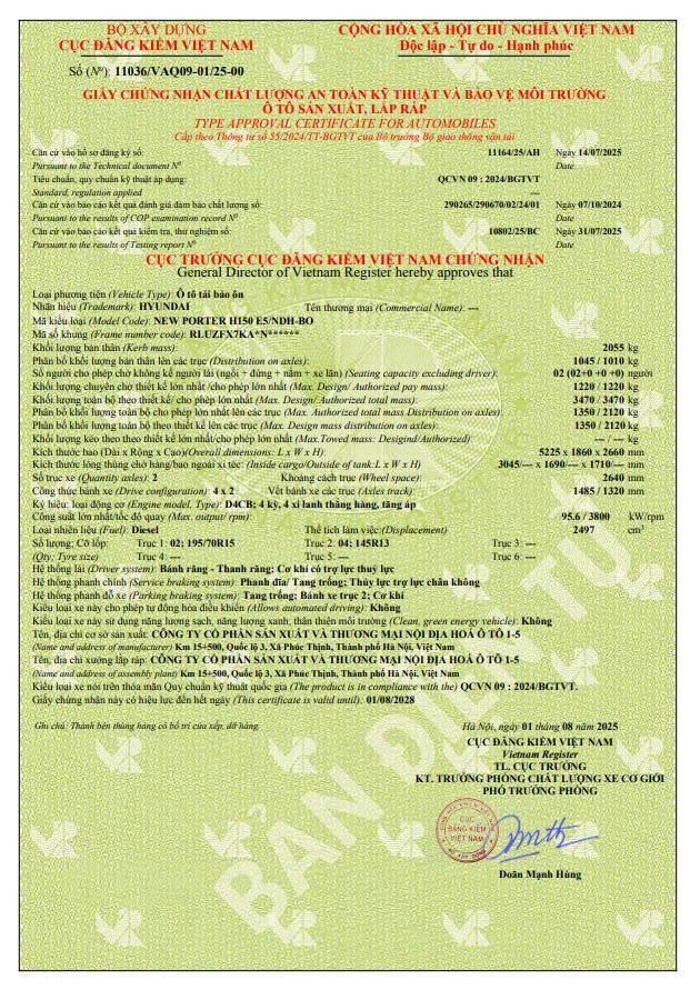 | Tên thương mại, mã kiểu loại | NEW PORTER H150 E5/NDH-BO |