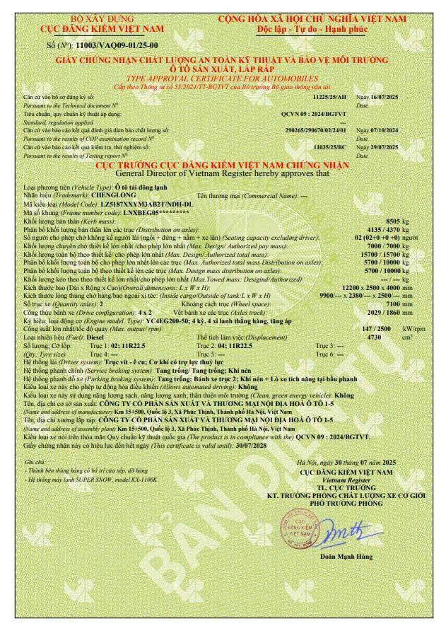 | Số lượng, cỡ lốp | 02;11R22.5/ 04;11R22.5 |