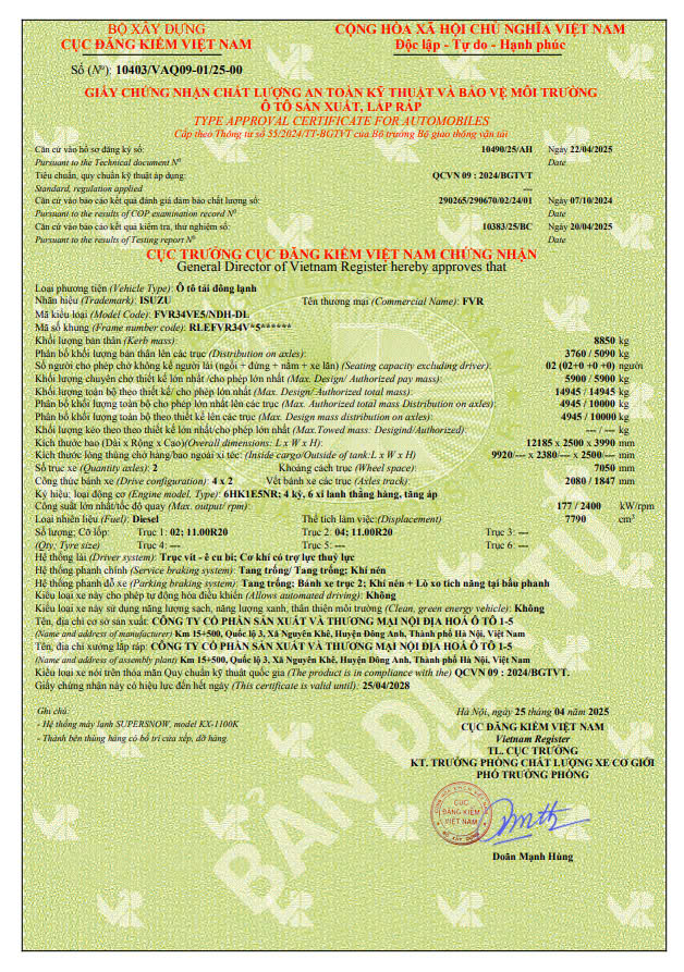 | Loại phương tiện | Ô tô tải đông lạnh |