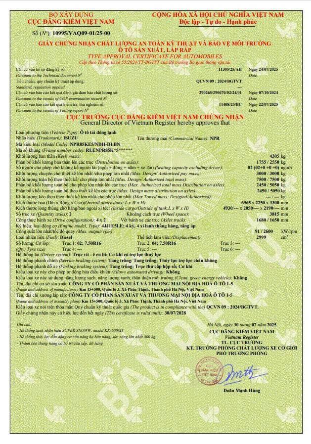 | Loại phương tiện | Ô tô tải đông lạnh |