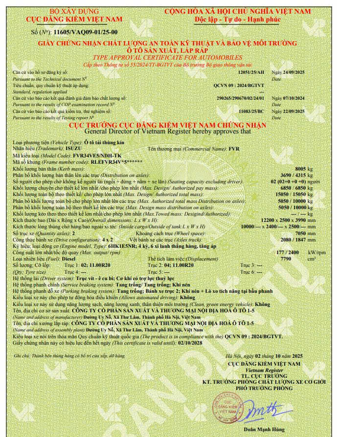 | Tên thương mại, mã kiểu loại | FVR FVR34VE5/NDH-TK |