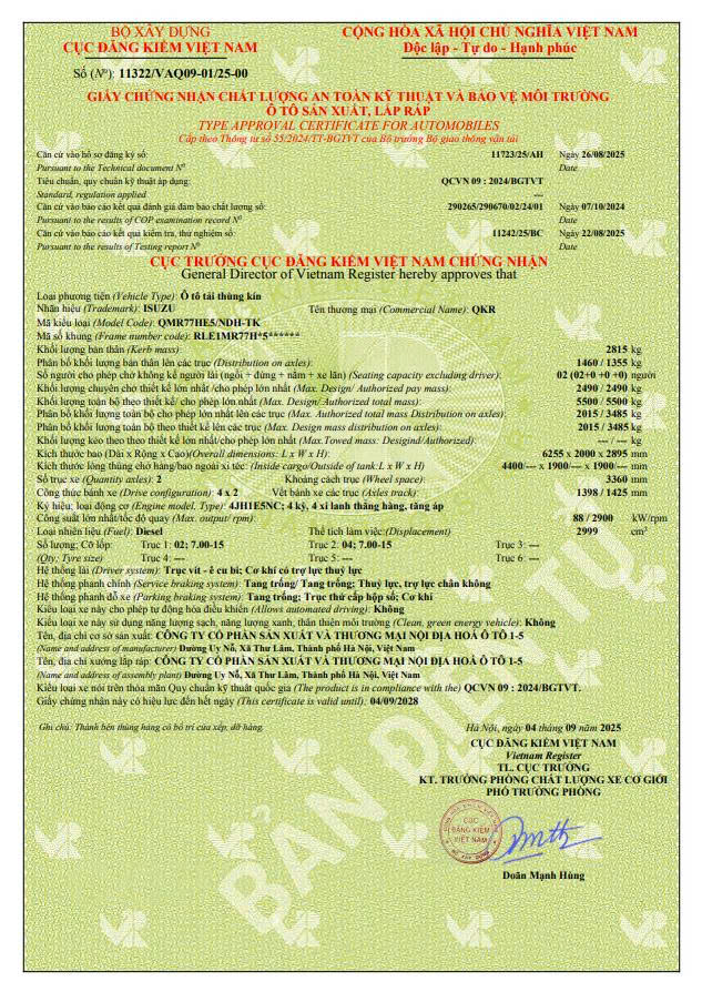 | Loại phương tiện | Ô tô tải thùng kín |